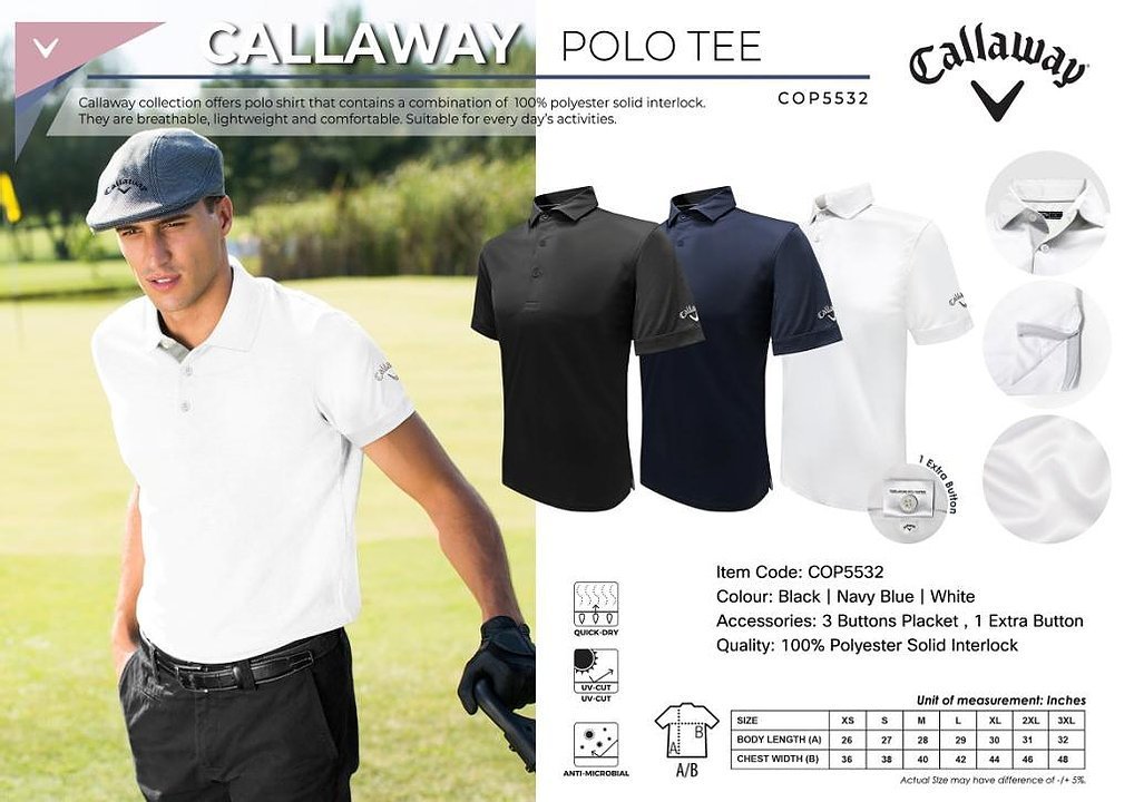 Callaway collection offers polo shirt that contains a combination of 100% polyester solid interlock. They are breathable, lightweight and comfortable. Suitable for every day’s activities.