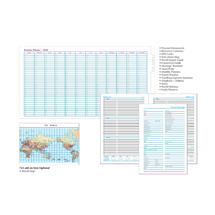 • Features: Personal Memoranda, yearly planner, IDD codes, world airport guide, world map, conversion guide, meetings’ timetable, leave plans, monthly planners, travel checklist, traveling expenses summary, telephone + address, notes, world holidays.